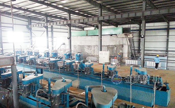 本工藝采用兩段一閉路破碎流程,合格產(chǎn)品進入粉礦倉緩存,礦石由擺式給礦機均勻的給到直筒節(jié)能格子型球磨機進行磨礦,格子球磨機和高堰式單螺旋分級組成一段閉路磨礦分級流程。球磨機的排礦先經(jīng)過跳汰機富集大顆粒金,跳汰機底流通過兩段搖床選出30%品位的顆粒金,跳汰機的溢流進入分級機。分級溢流經(jīng)過攪拌槽的調(diào)漿后進入浮選系統(tǒng),通過做礦石的可選性實驗研究我們選擇一粗三精三掃的浮選流程,從而很大程度的回收脈石中的有價金元素。浮選金精礦通過濃密機濃縮由過濾機完成脫水作業(yè),浮選尾礦由濃密機濃縮后進入壓濾機進行壓濾成濾餅做到尾礦干排。金礦重浮聯(lián)合流程也是金鵬集團用于山東黃金集團蓬萊大柳行選廠項目中的成功經(jīng)驗。
