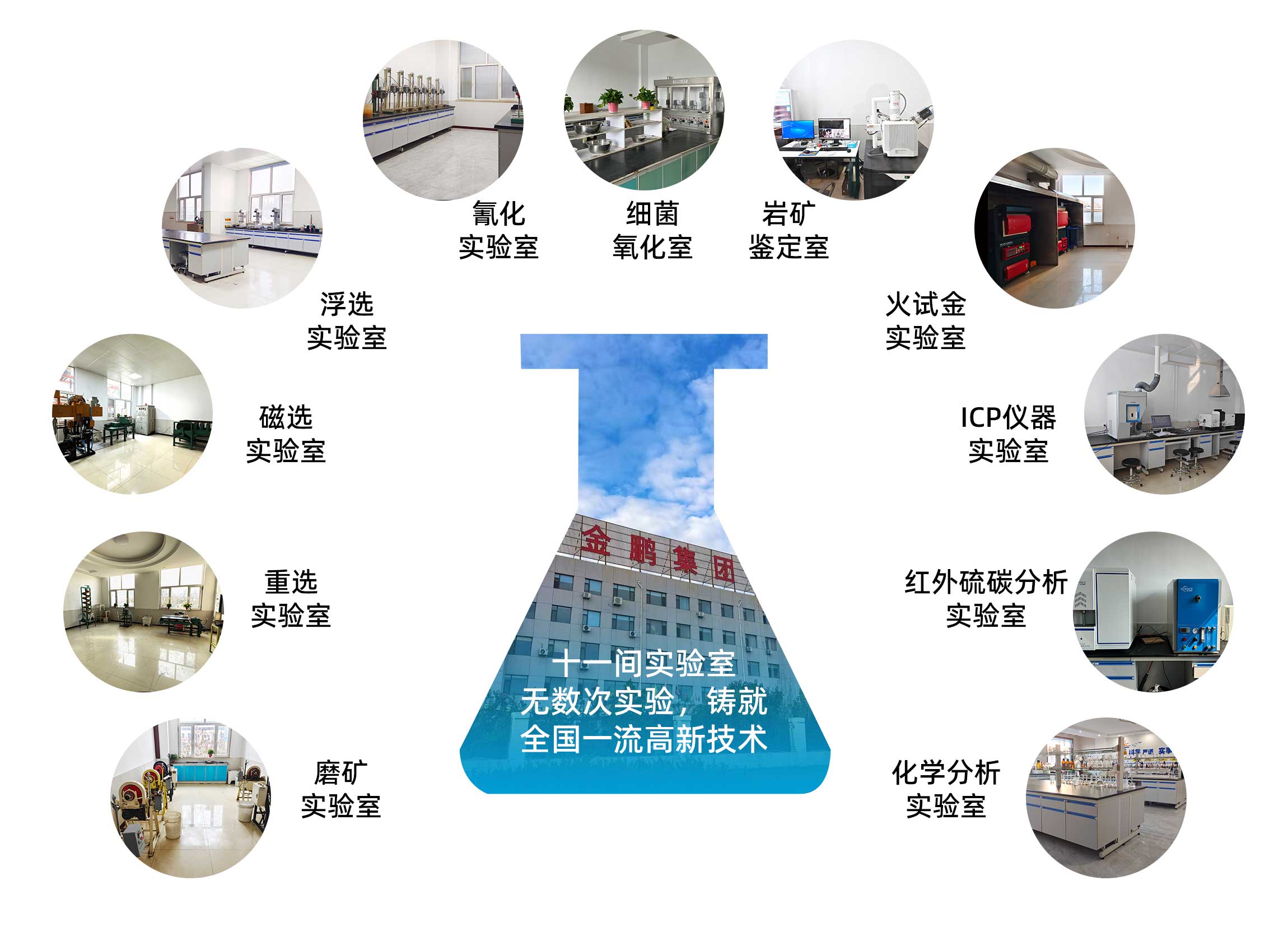 為了更好的進行選礦試驗研究工作,金鵬集團斥資打造了十一大先進的實驗室, 50多位選礦研究專家,先后承擔了上千個礦山項目實驗工作,經驗豐富。實驗室 配備了完善的選礦實驗研究設備和巖礦鑒定設備。能夠進行各種有色金屬,黑色金屬 及非金屬復雜難選冶礦石的實驗研究工作。其中黃金、白銀、銅礦、鉛鋅礦、鎢鉬銻礦 、鈦鐵礦、錳礦、磁褐鐵礦、赤鐵礦選礦技術,鉀鈉長石、石英、螢石、石墨等非金屬 提純、各種氧化礦的回收、綜合利用等多項研究成果已處于國際國內領先水平。