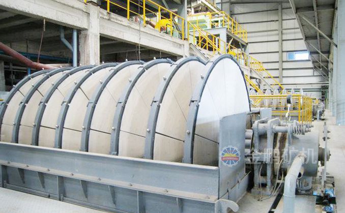 圓盤真空過濾機是一種固液分離設備,過濾圓盤由調速電機通過減速器及開式齒輪傳動來驅動,使之在裝滿礦漿的槽體中以一定的轉速轉動,當過濾圓盤的某一濾扇處在過濾吸附區時,借助于真空泵的作用在過濾介質兩側形成壓力差,使固體物料吸附在過濾介質(濾布)上并形成濾餅,而濾液則經濾液管及分配頭排出。當這一濾扇從礦漿液位中脫離而進入脫水區后,濾餅在真空的抽吸力作用下,水不斷與濾餅分離,進一步從濾液管及分配頭排出,濾餅因此而干燥。進入卸料區后,濾餅用反吹風和刮刀自濾盤上卸下,落入排料槽,由集礦皮帶運輸機運走,整個作業過程連續不斷地進行。
