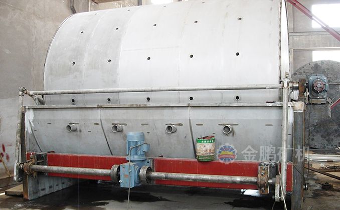 外濾式筒形真空過濾機(jī)主要由筒體、傳動(dòng)機(jī)構(gòu)、分配頭、主軸承、攪拌器、礦漿槽、刮板和繞線機(jī)構(gòu)等構(gòu)成。