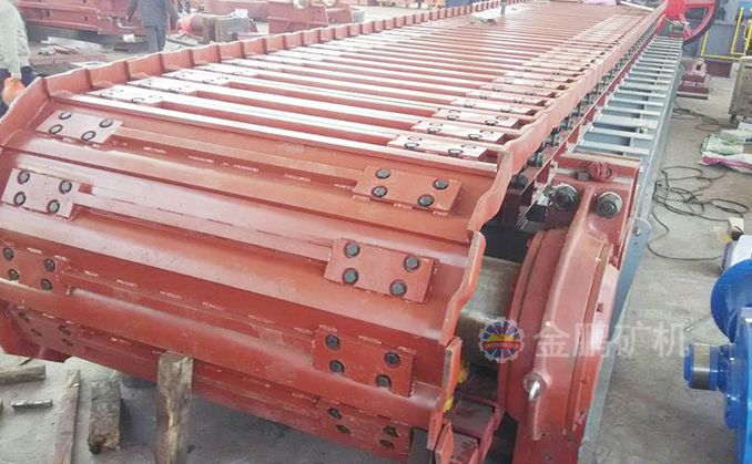采用節(jié)距為200mm的高強(qiáng)度模鍛鏈條為牽引件,兩根鏈條繞過安裝在機(jī)體頭部的一對(duì)驅(qū)動(dòng)鏈輪和機(jī)體尾部的一對(duì)張緊輪聯(lián)成封閉形回路,在兩排鏈條的每個(gè)鏈節(jié)上裝配了相互交迭的、重型結(jié)構(gòu)的輸送槽而成為一個(gè)連續(xù)的能夠運(yùn)載物料的輸送線路。其自重和物料的重量由安裝在機(jī)體上的多排支重輪、鏈托輪和滑道梁支承。傳動(dòng)系統(tǒng)經(jīng)交流變頻調(diào)速電動(dòng)機(jī)聯(lián)接減速機(jī),再由漲套與驅(qū)動(dòng)裝置直聯(lián)驅(qū)動(dòng)運(yùn)載機(jī)構(gòu)低速運(yùn)行。將尾部料倉卸入的物料沿輸送線路運(yùn)至機(jī)體的前方排出,實(shí)現(xiàn)向下方的工作機(jī)械連續(xù)均勻喂料的目的。