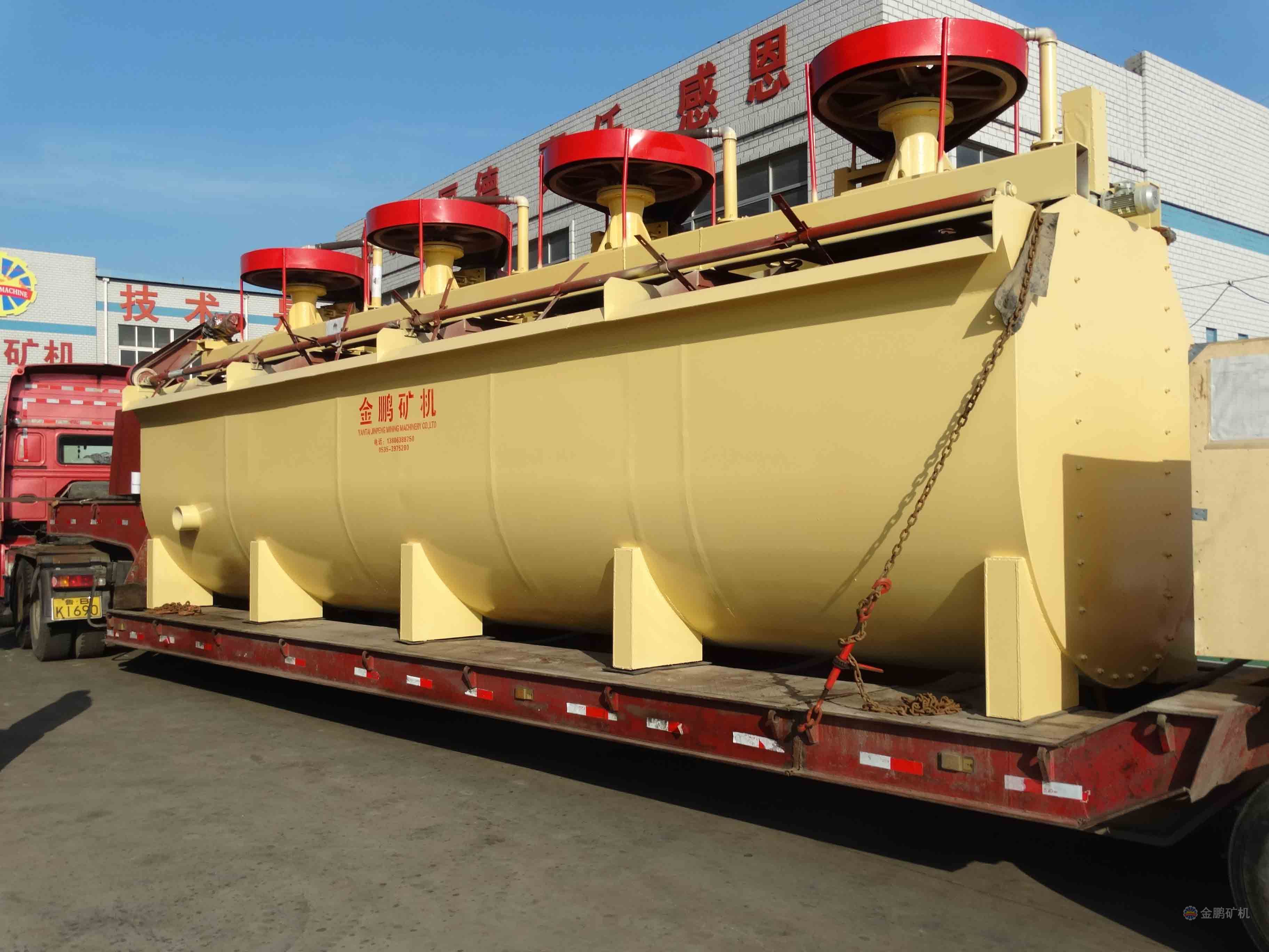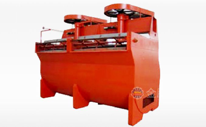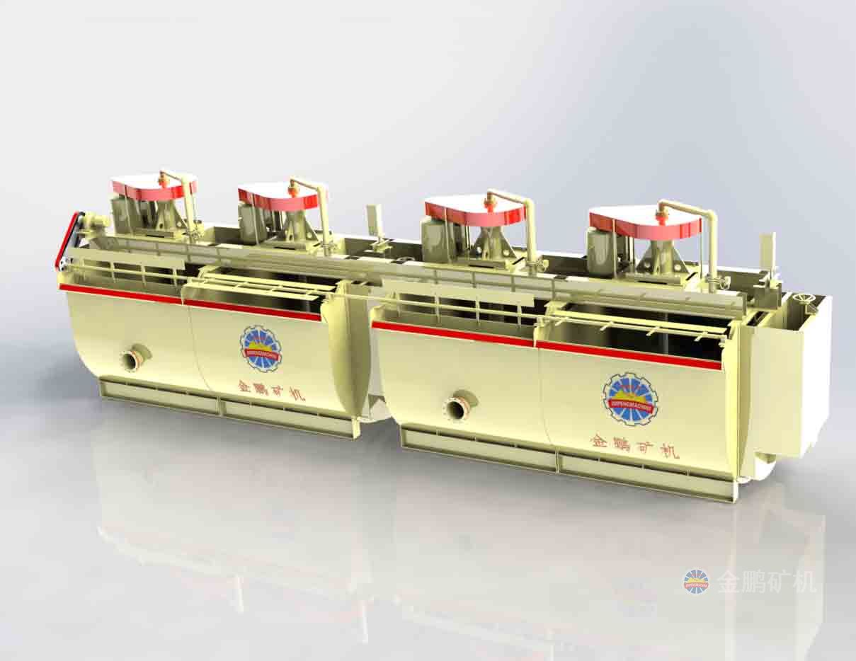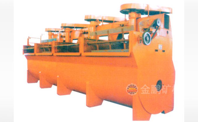 該浮選機(jī)工作時(shí),隨著葉輪的旋轉(zhuǎn),槽內(nèi)礦漿從四周經(jīng)槽底由葉輪下端吸到葉輪葉片之間由鼓風(fēng)機(jī)給入的低壓空氣經(jīng)空心軸和葉輪腔的空氣分配器,也進(jìn)入其中。礦漿與空氣在葉片之間充分混合后,從葉輪上半部周邊向斜上方推出,由定子升穩(wěn)流和定向后進(jìn)入整個(gè)槽子中。氣泡上升到泡沫穩(wěn)定區(qū),礦化富集后,自溢流堰溢出。另一部分礦漿向葉輪下部流去,再經(jīng)攪拌,重新混合形成礦化氣泡。剩余的礦漿流向下一槽直至最終成尾礦。