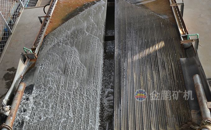 礦粒群從6s搖床床面上角的給礦槽送入,同時(shí)由給水槽供給橫向沖洗水,于是礦粒在重力,橫向流水沖力,床面作往復(fù)不對(duì)稱運(yùn)動(dòng)所產(chǎn)生的慣性和摩擦力的作用下,按比重和粒度分層,并沿床面作縱向運(yùn)動(dòng)和沿傾斜床面作橫向運(yùn)動(dòng)。比重和粒度不同的礦粒沿著各自的運(yùn)動(dòng)方向逐漸扇形流下,分別從搖床精礦端和尾礦側(cè)的不同區(qū)排出,最后被分成精礦,中礦和尾礦。